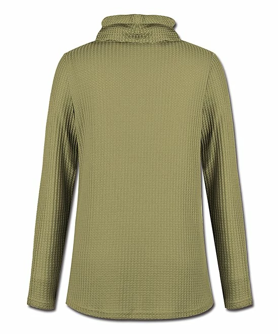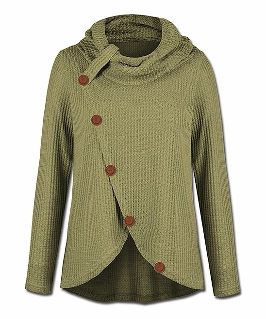 Add a cozy layer to your ensembles with this waffle-knit sweater designed with an overlapping button-accented tulip hem and a slouchy cowl neck.