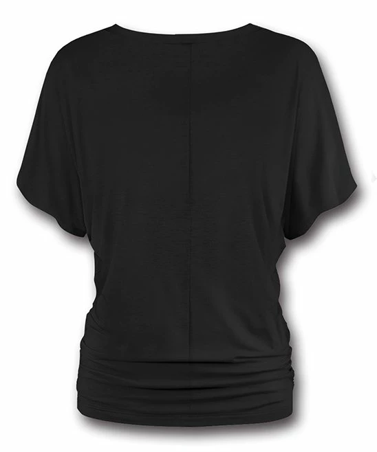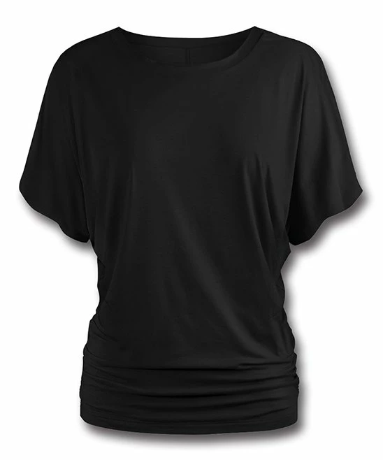 Draping dolman sleeves, side ruching and a banded hem give this top a slouchy profile that sets the stage for relaxed days, and the simple solid color maximizes its mix-and-match power.