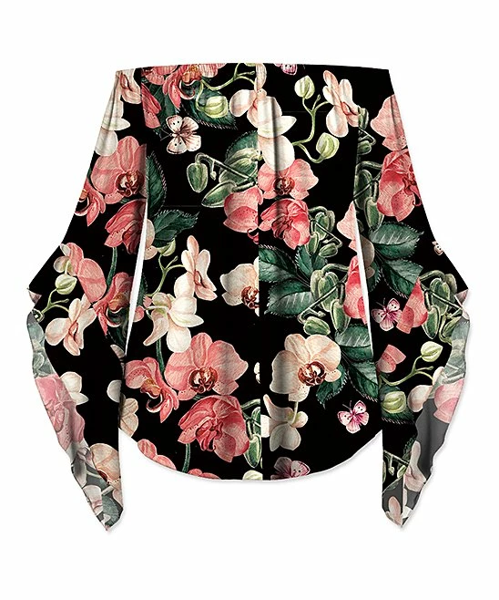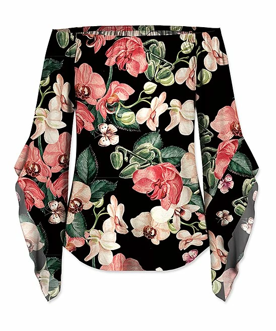 Invoke Renaissance-inspired vibes with this off-shoulder top featuring flowing bell sleeves and a vibrant floral pattern.
