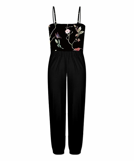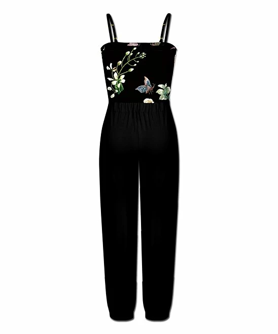 This one-piece jumpsuit has the look of separates with a printed top and solid bottoms. The cool sleeveless cut has a fresh look with jogger cuffs.