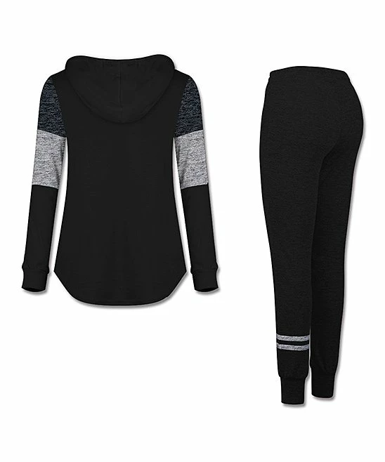 - Includes black and gray contrast-sleeve hoodie and black and gray side-stripe joggers (two pieces total)
