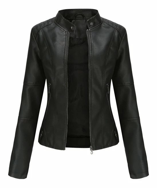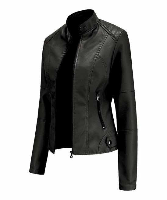An edgy moto jacket with a zip-up design, snap button collar and convenient side pockets.