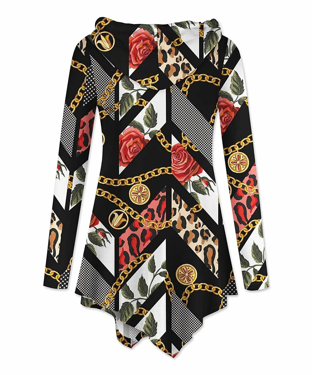 Show off your fashion instincts in this patterned hoodie created with stretchy knit fabric for comfortable style. A unique handkerchief hemline adds a trend-driven finishing touch.