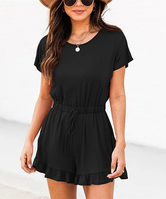 Complete with ruffles and a drawstring accent, this lightweight romper brings a casual warm-weather look to your wardrobe.