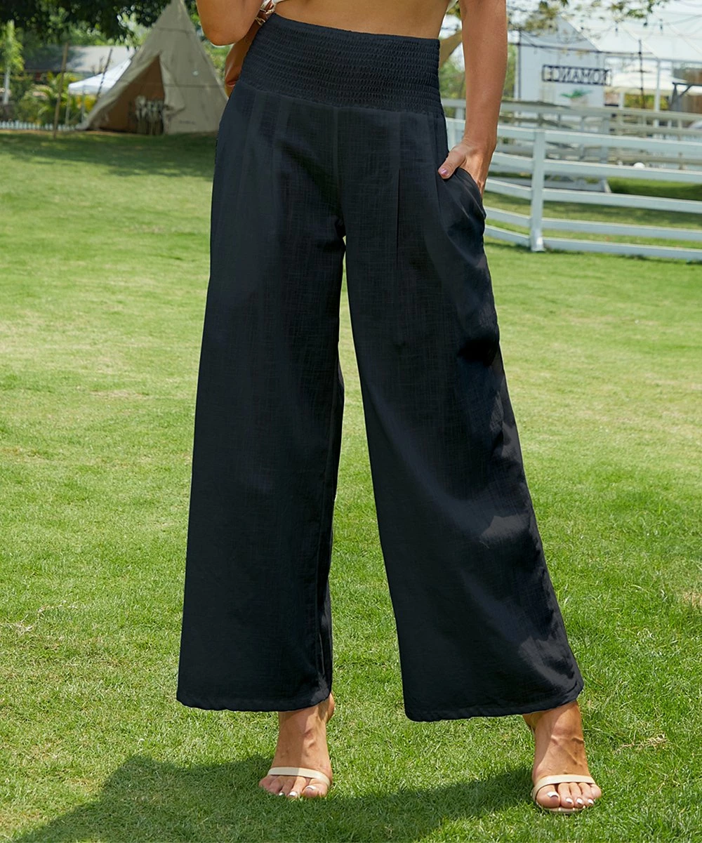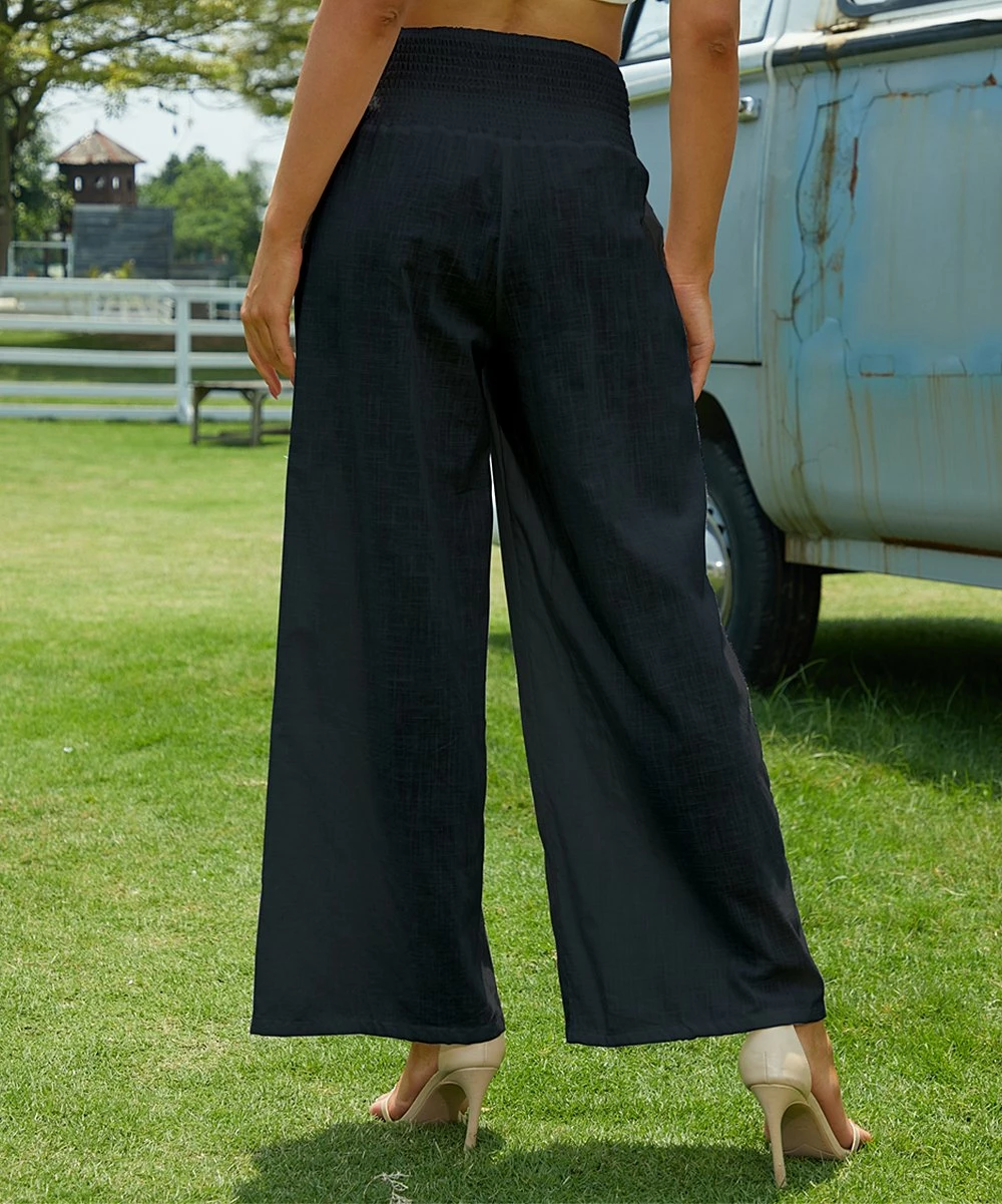A high smocked waistband and front pleats make these versatile wide-leg pants great for work or play.