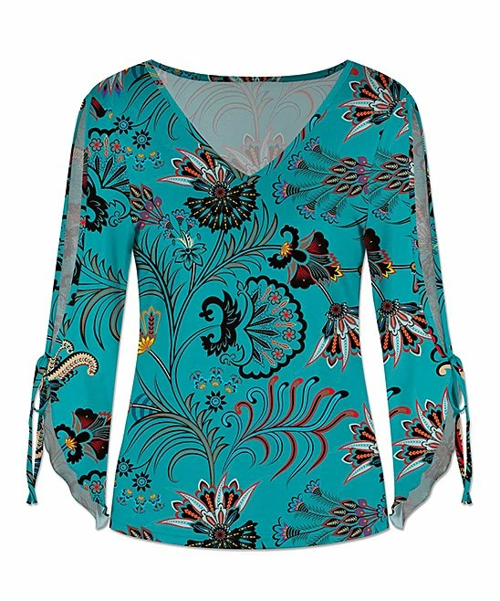 Create a wow-worthy look with this V-neck top featuring comfortable knit fabric and angled, side-slit sleeves you can tie together or let hang loose.