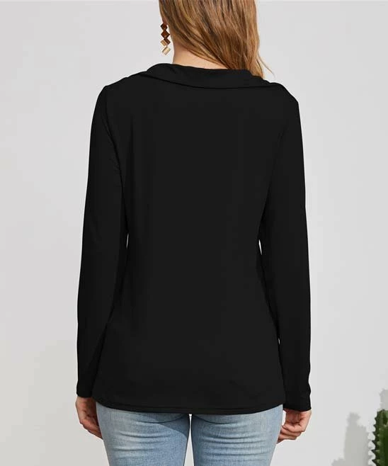 Long-sleeve top featuring a collared v-neckline and stretch-enhanced construction.