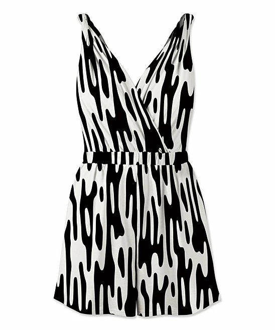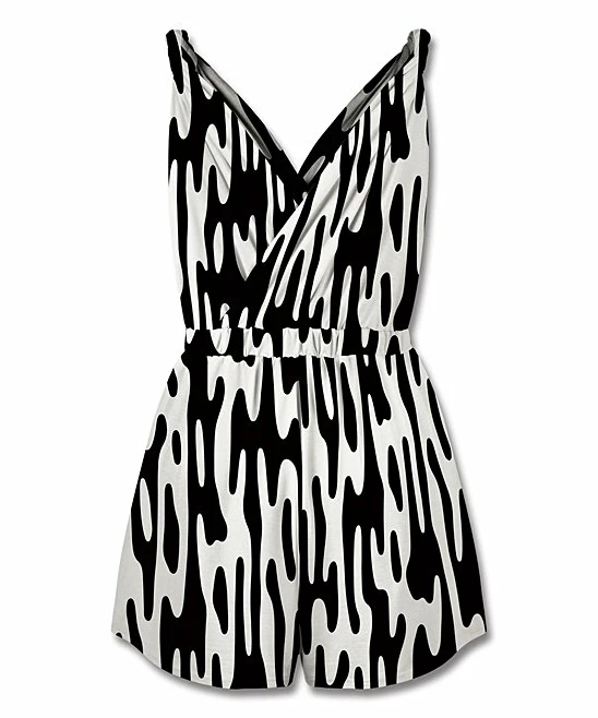 Brightly patterned romper showcasing a sleeveless silhouette with a surplice neckline and an elastic band at the waist.