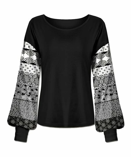 Puffy printed sleeves frame this lightweight top that’s fitted with a hint of stretch for a relaxed feel.