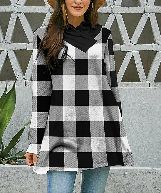Bring casual style to your everyday looks in this tunic’s shawl-collar design and plaid pattern.