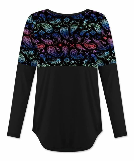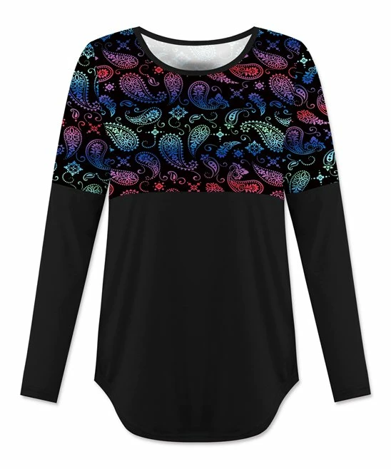 Long-sleeve top featuring a gracefully curved hem and patterned shoulders.