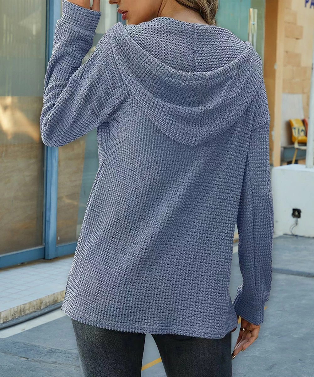 Keep cozy in this long-sleeve hoodie featuring a textured feel and button-up neckline.