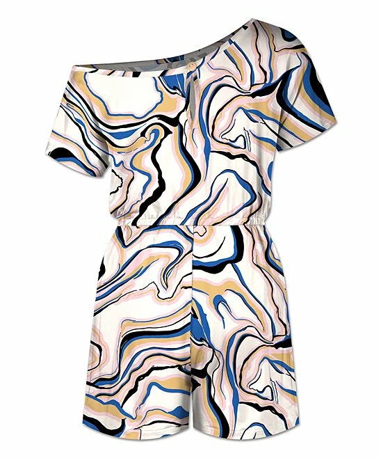 Brightly patterned romper showcasing an elastic band at the waist and an asymmetrical neckline that shows a little shoulder.