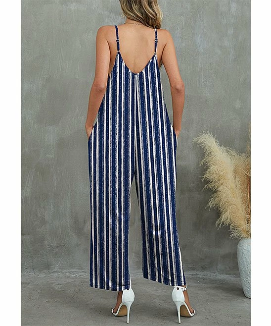 This sleeveless jumpsuit provides pockets and a classic stripe design crafted in a stretch-kissed fabric.
