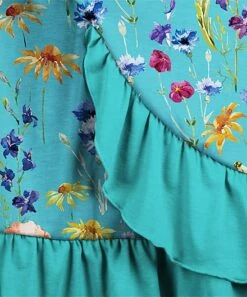 Ruffle accents and a vibrant floral print add feminine appeal to this wrap skirt made from lightweight, stretch-friendly fabric.