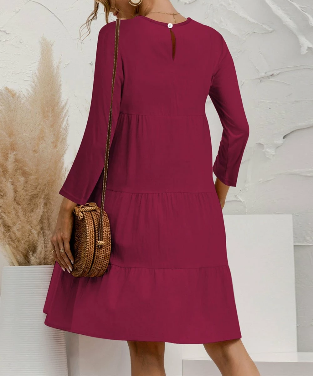 Update your weekend wardrobe with this ultra-flowy shift dress featuring a tiered design and long sleeves for comfortable coverage. Stretch-enhanced fabric.