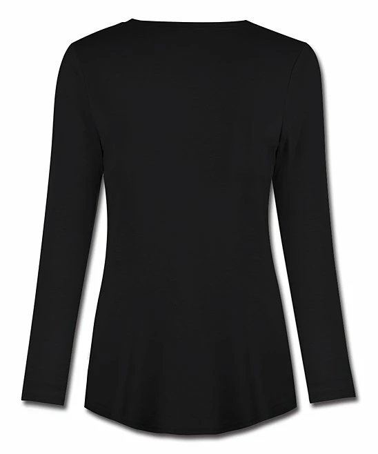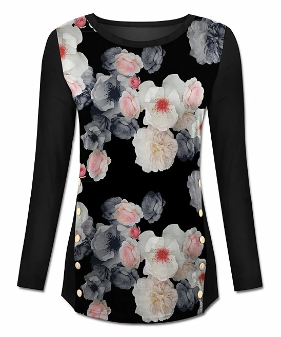 Decorated with button accents down each side, this stretch-blend tunic also features a print-splashed front panel and contrast sleeves for a contoured appearance.