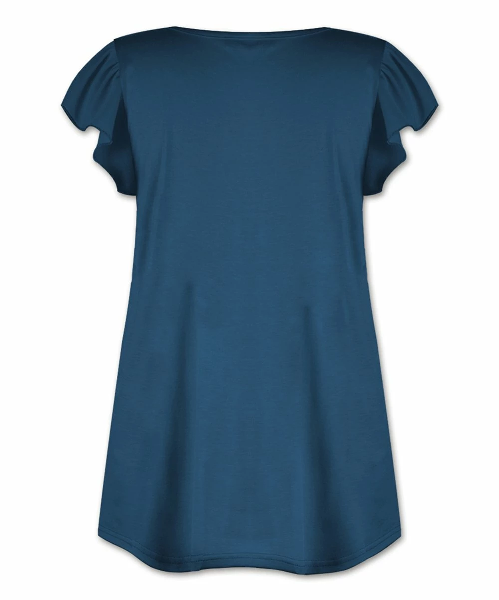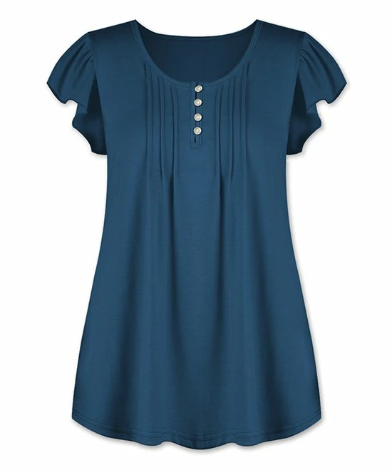 Update your casual wardrobe with this top featuring fluttering sleeves and poised pleats along the front. Button accents add put-together detail and stretch-blend material offers lasting comfort.