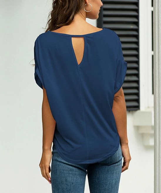 Casual, loose-fitting top featuring short cuffed dolman sleeves, a scoop neck and back keyhole cutout.