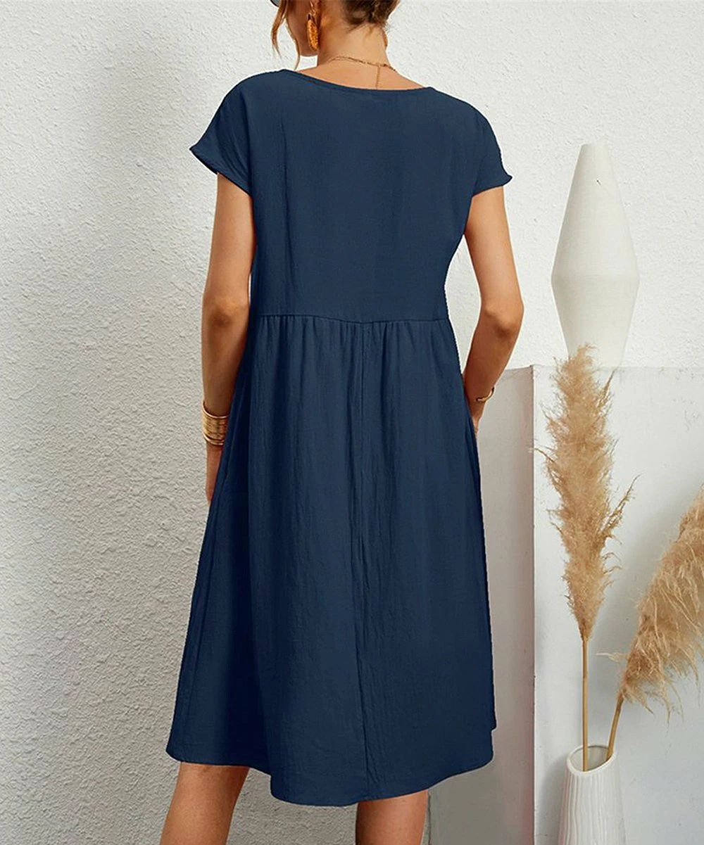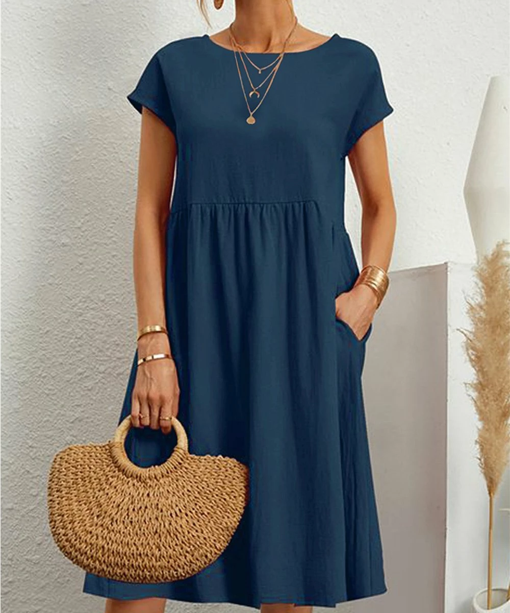 Expand your casual options with this round-neck dress featuring a classic A-line skirt, cap sleeves and handy side pockets.