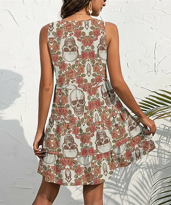 Bring fresh and edgy flair to your wardrobe with this sleeveless shift dress showcasing a floral skull pattern.