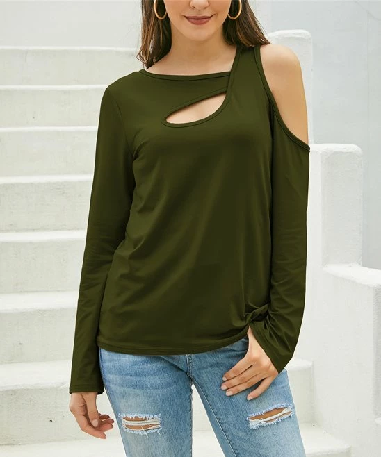 Cutouts add daring flair to this long-sleeved top made from soft, stretchy fabric for easy comfort.