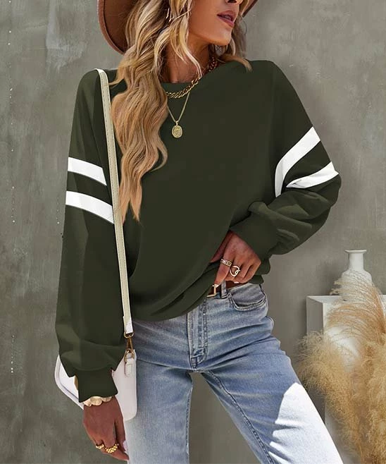This sporty top has a collegiate vibe with stripes across ample bishop sleeves and a casual attitude with a hint of stretch for all-day comfort.