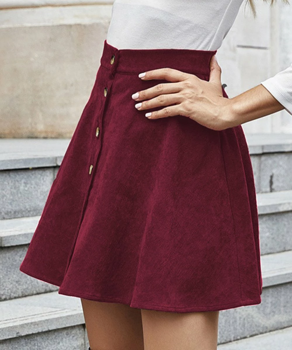 This versatile circle skirt features a button-up front and a hint of stretch for comfort.
