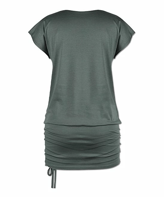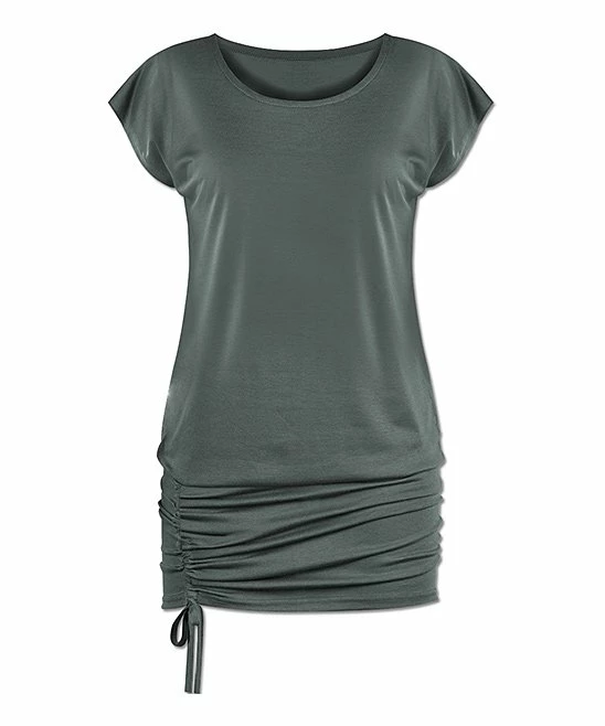 Stay comfy as can be in this relaxed tunic featuring comfortable stretch-enhanced material. Ruching along the sides and a tie accent create flattering definition with a blouson effect.