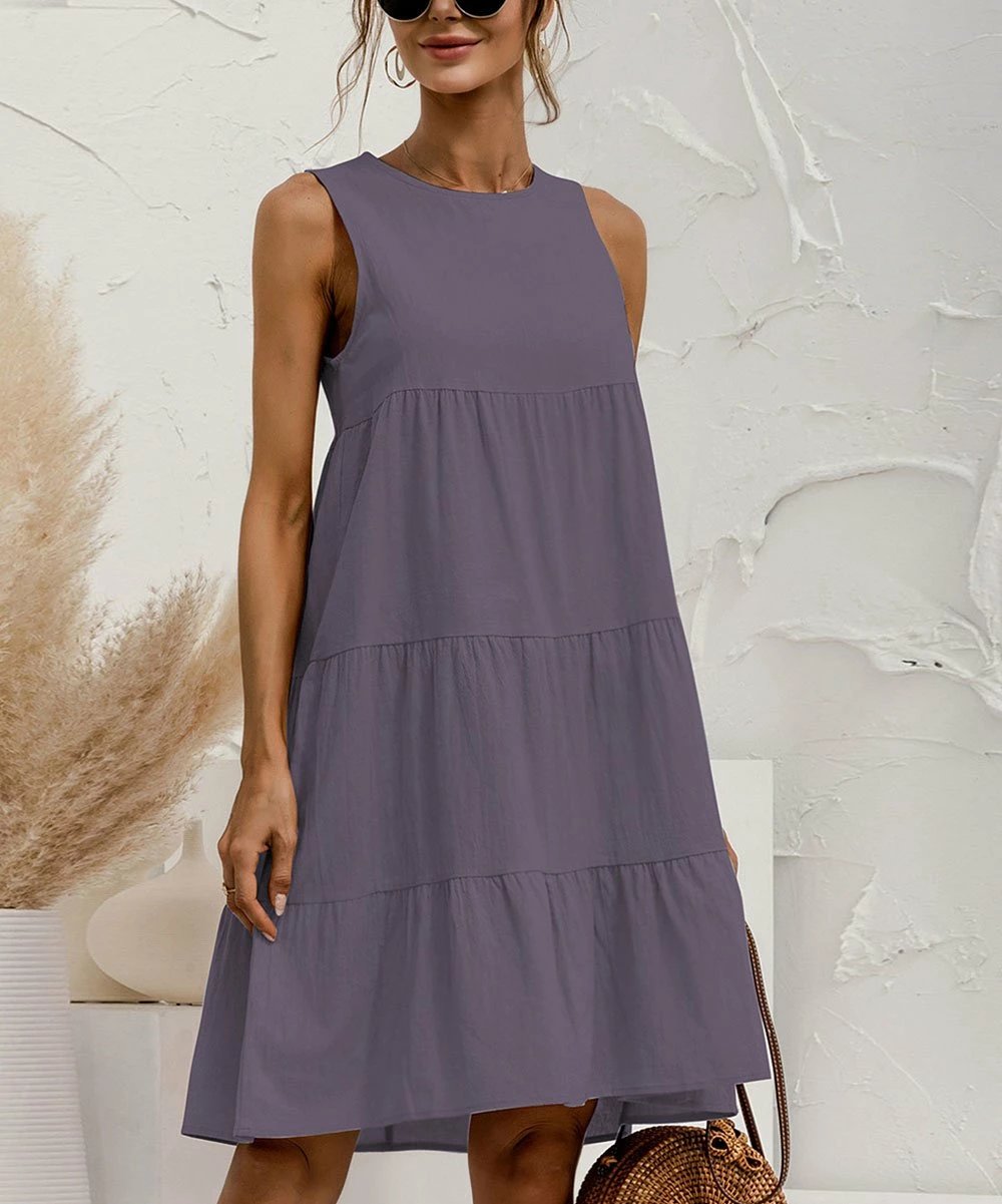 A sun-ready shift dress designed with stretch-infused fabric and a sleeveless cut that flaunts the shoulders.