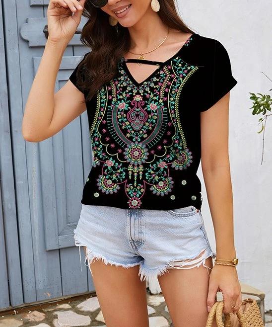 Elevate your everyday ensembles with the can’t-miss pattern of this stretchy knit top that features a V-cut neckline accented by a horizontal strap.