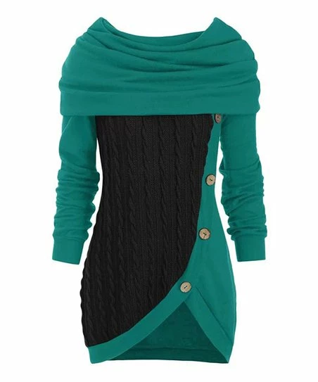 A chunky cowl neckline and knit fabric give this tulip-hem tunic a cozy fit.