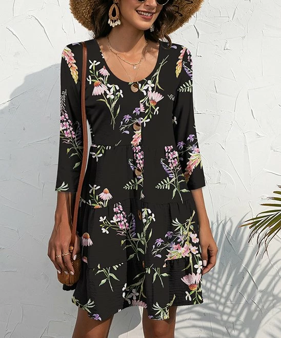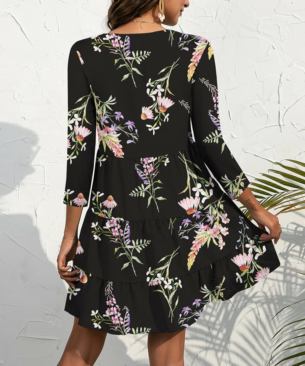 Scoop neck shift dress featuring a tiered silhouette with floral print and button accents