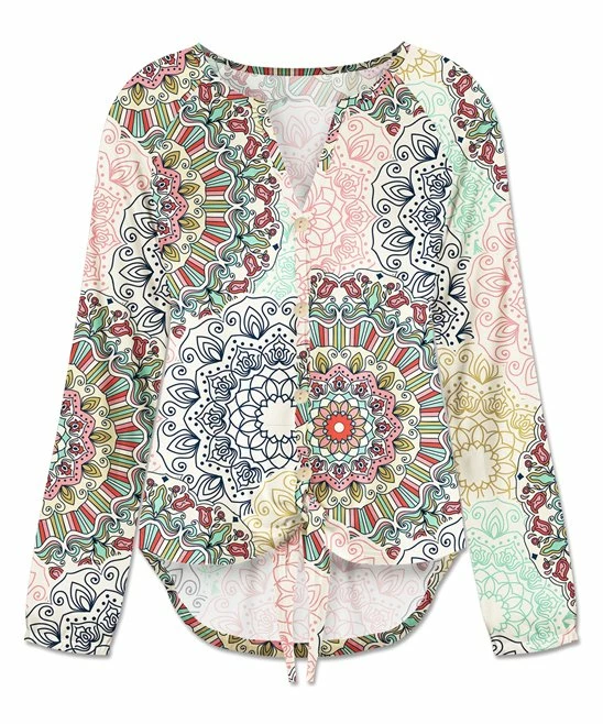 Give your wardrobe a refresh with this boldly printed top that features a button-up front and a tied-hem detail.