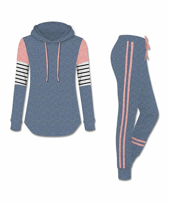 - Includes heather blue and heather orange-pink stripe color block hooded top and heather blue and heather orange-pink side-stripe joggers (two pieces total)