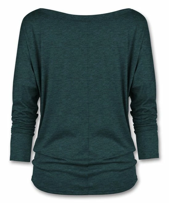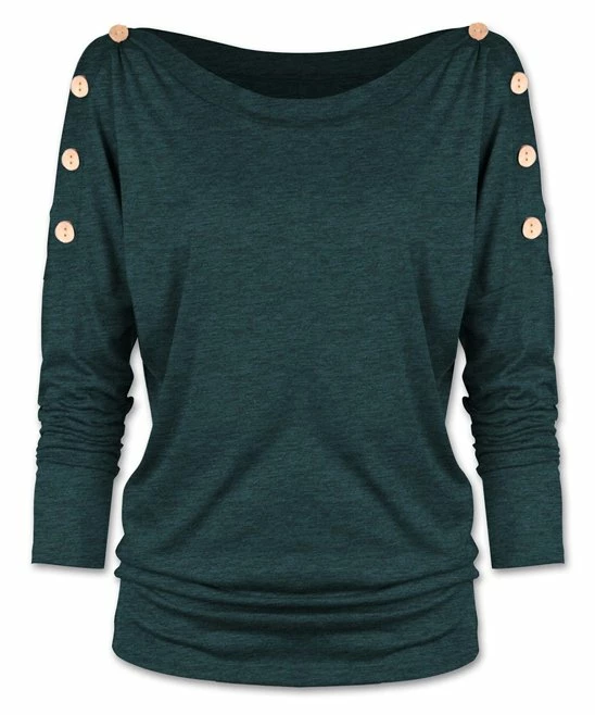 Pair it with jeans or slacks and you’ll be ready for cooler days with this long-sleeve top featuring a loosely ruched hemline and side button accents.