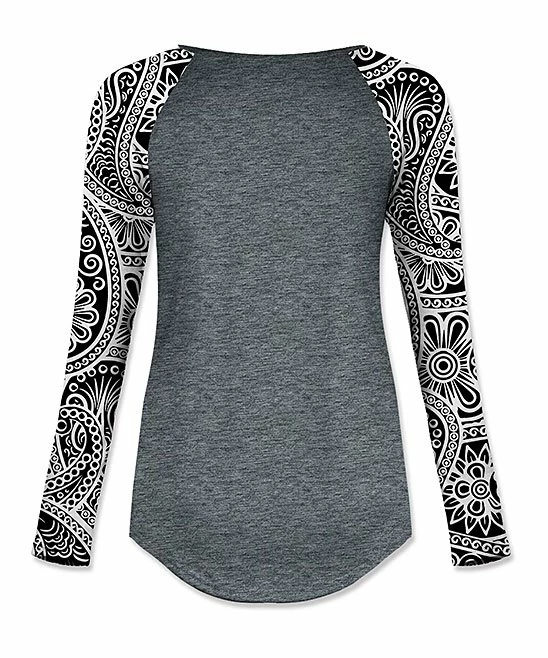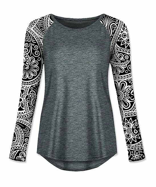 Designed for optimal comfort with a hint of stretch, this soft raglan tee boasts a bold print along the long sleeves for a touch of flair.