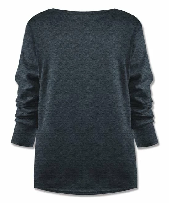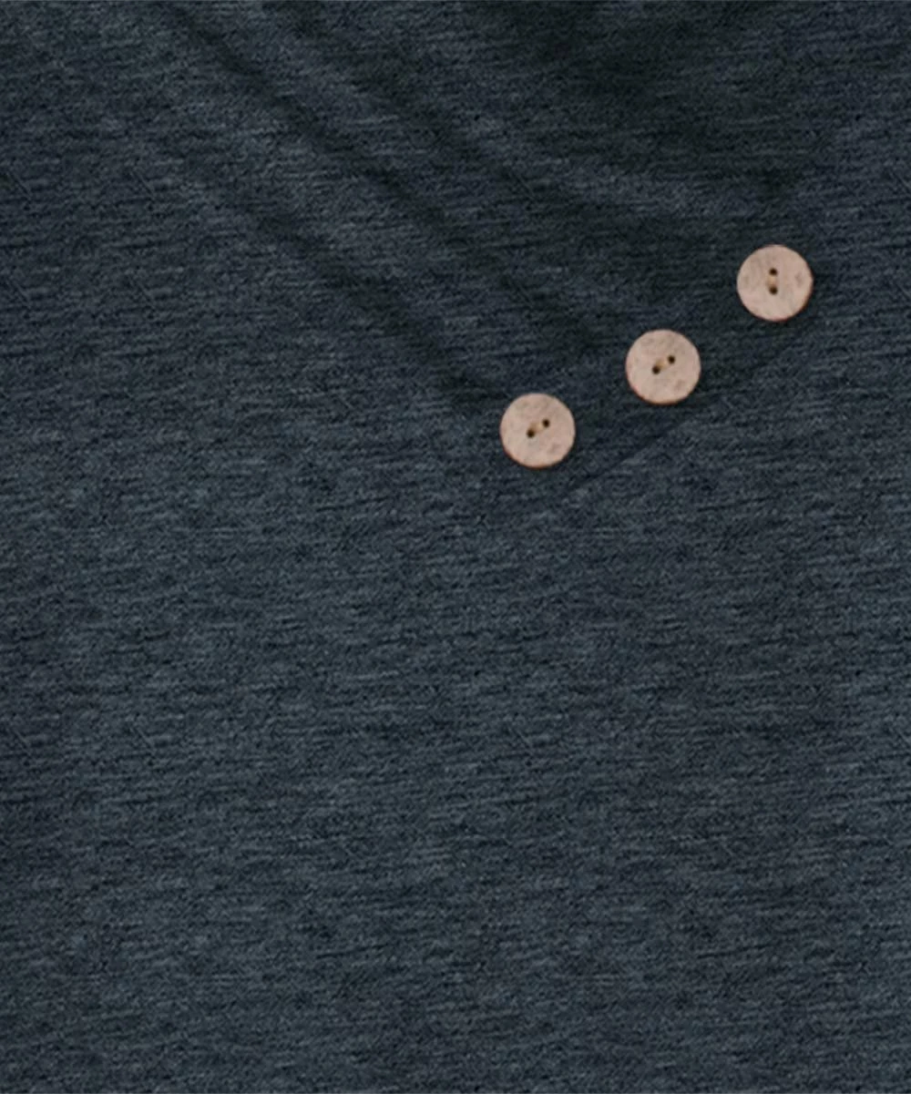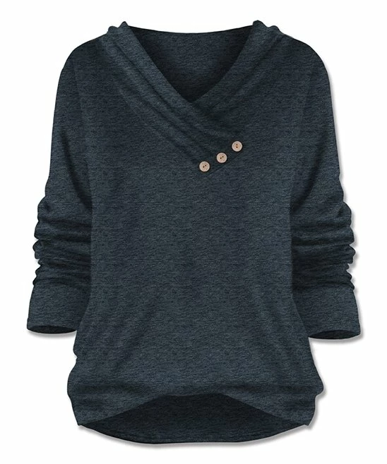 Stay cozy in style with this solid-hued top boasting stretchy fabric and a button-embellished cowl neckline for comfortable wear that pairs effortlessly with jeans or leggings.