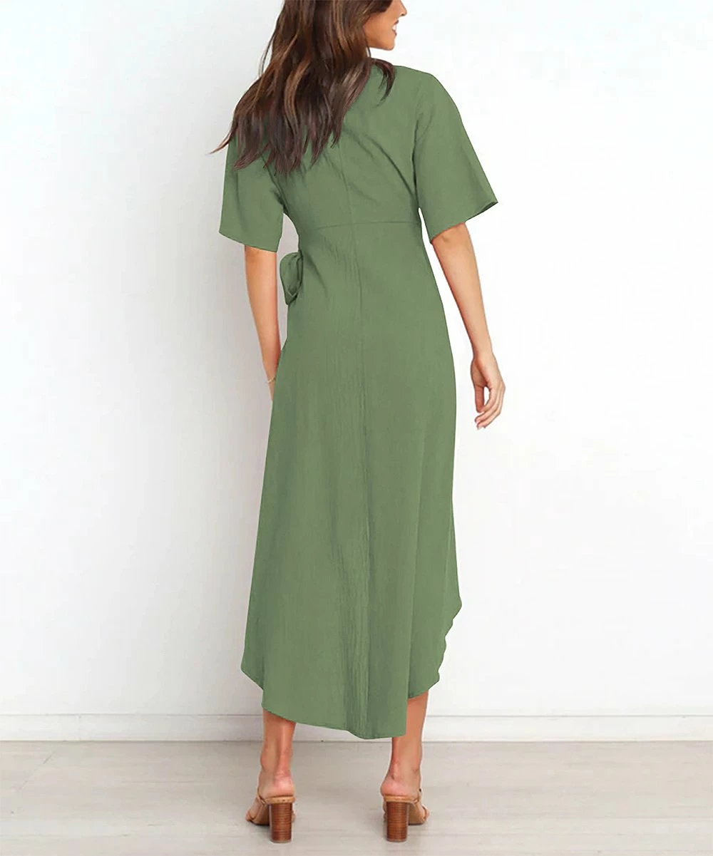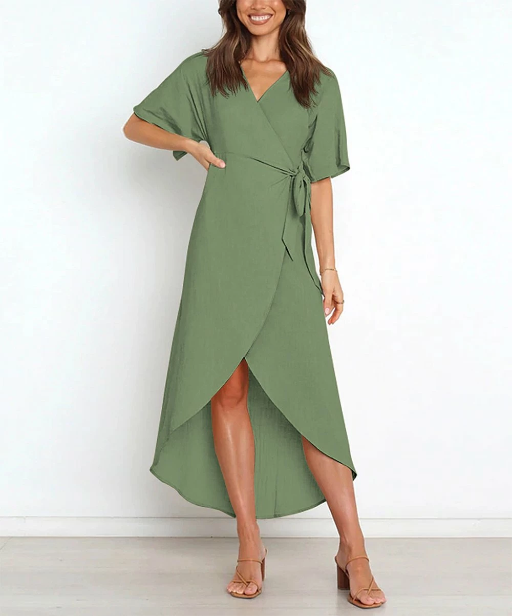 This maxi wrap dress features a hi-low tulip skirt that ties at the waist for a defined hourglass shape.