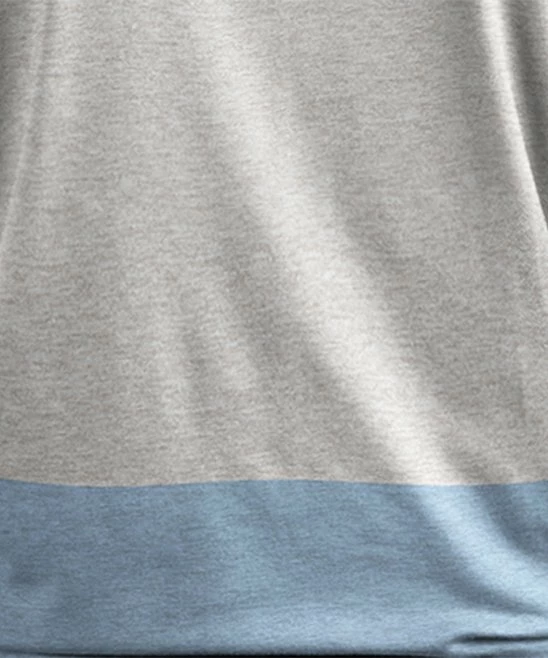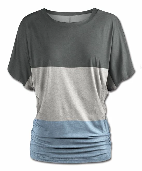 Short-sleeve dolman top featuring a curve-hugging waist with side ruching, round neck and a color block pattern.