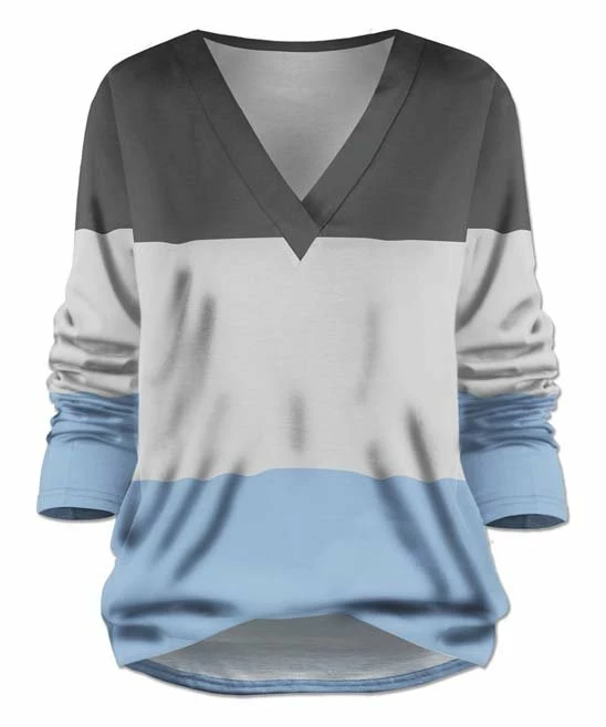 Update your casual wardrobe with this classic long-sleeve v-neck top featuring a fashionable contrast print.