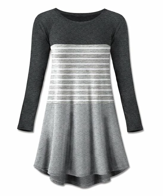 Add a little swish to your step with this flowing tiered tunic decorated in three coordinating hues and prints.