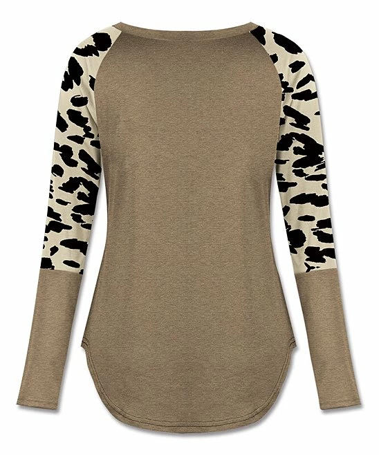 Animal-inspired trim along the long sleeves lends exotic style to this cozy tee fashioned with a hi-low hem for flattering flair.