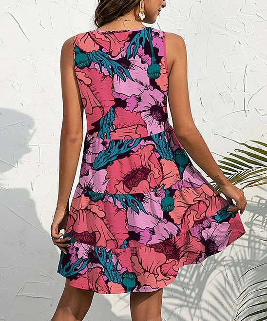 This sleeveless dress features button-front silhouette and flattering V-neckline.