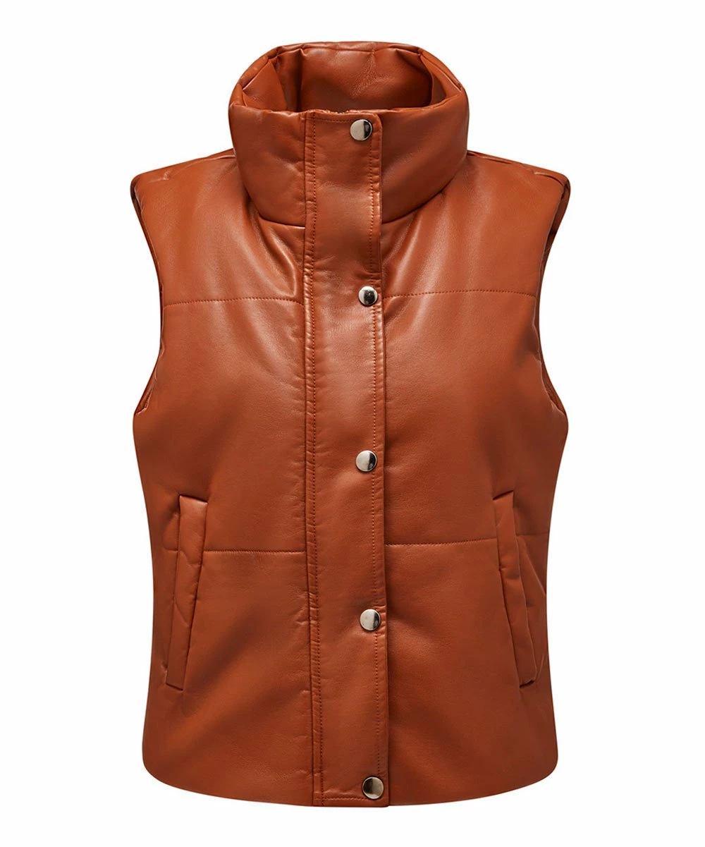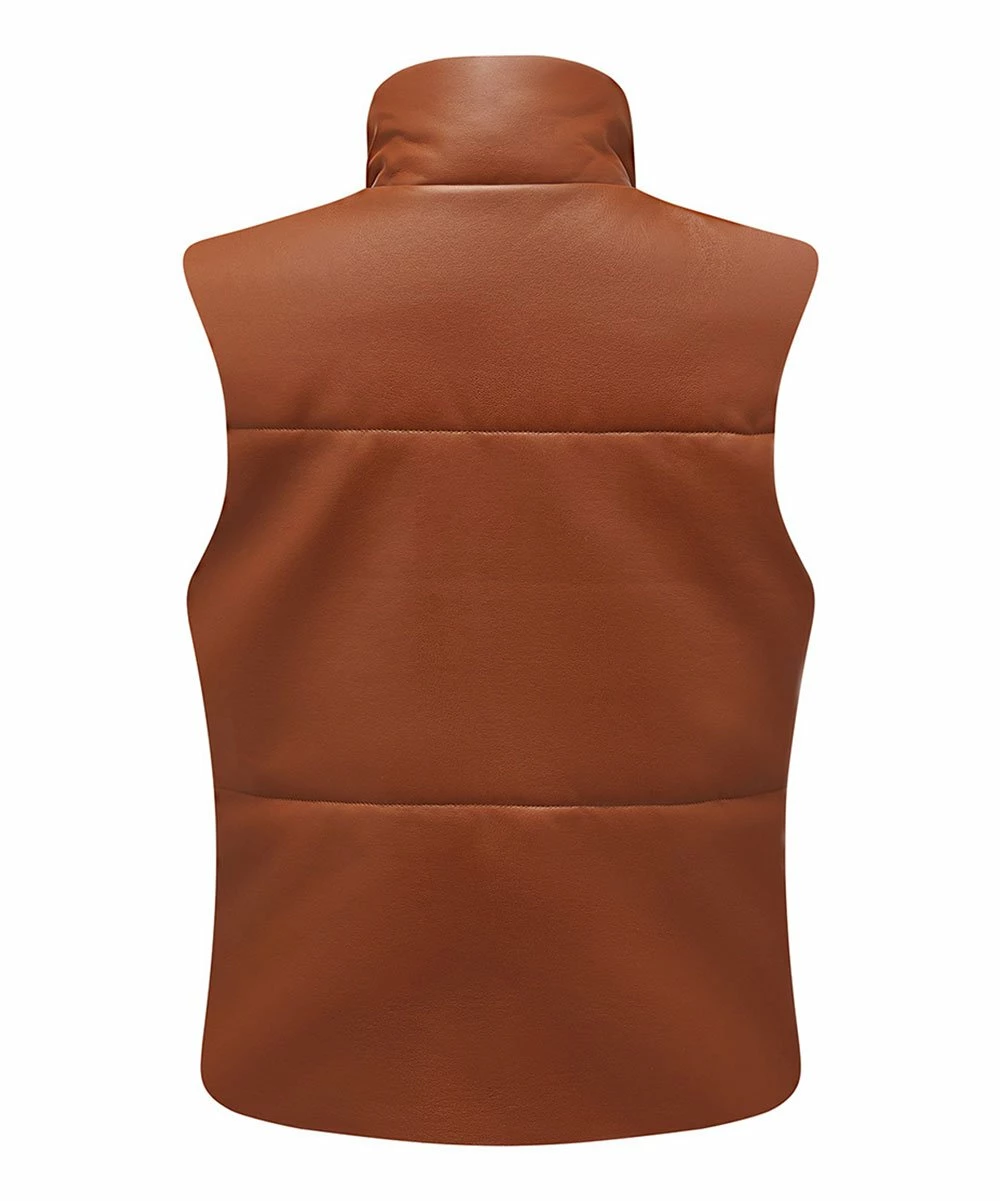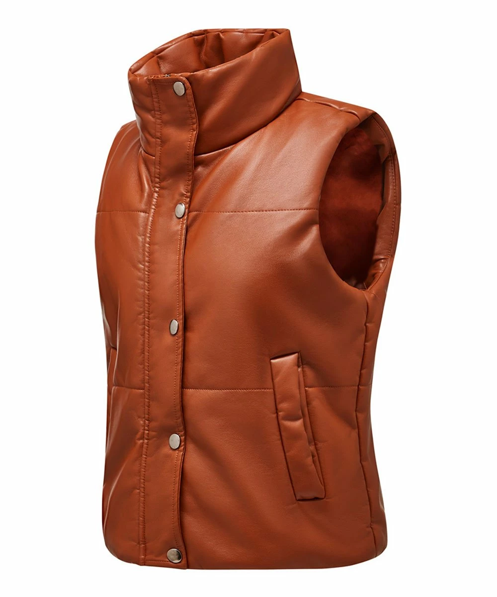 This faux leather vest keeps your core warm while the high collar extends the comfort. Pockets along the sides.