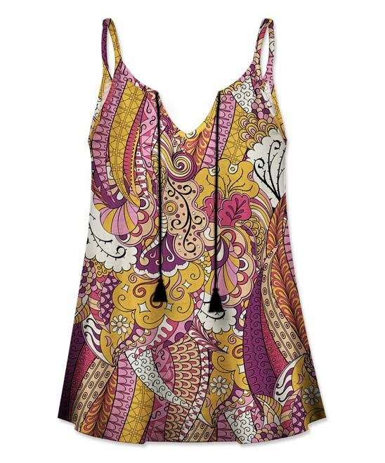Fluttery tassels and a flowing fit lend bohemian flair to this camisole that sports a retro-inspired pattern.