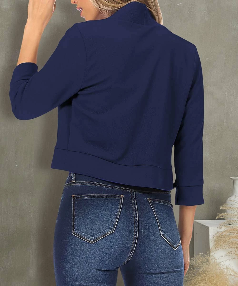 This cropped blazer features a hint of stretch, a shawl collar and cuffed three-quarter sleeves.