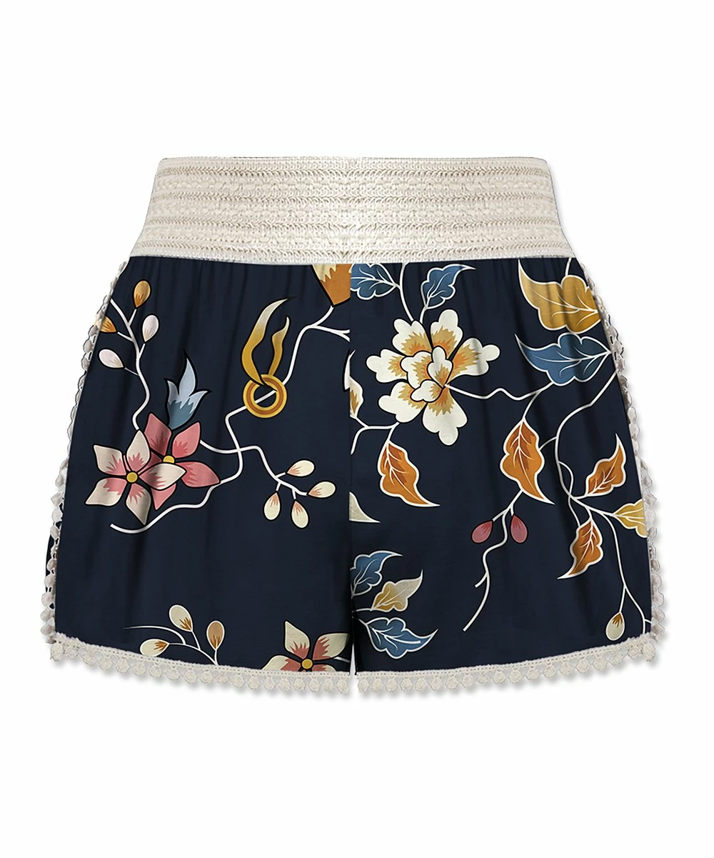 Add a little fun to your warm-weather wardrobe with these lightweight shorts featuring a bold print and pom-pom trim along the hem.