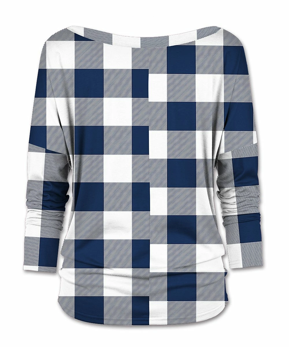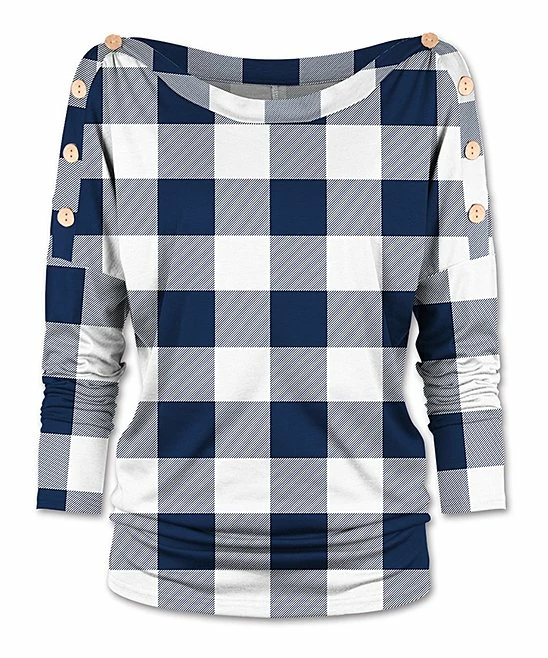 Get a fresh textured look for your weekend collection with this buffalo check long-sleeve that boasts button detailing along the shoulders and plenty of ruched detail along the sleeves and hemline.