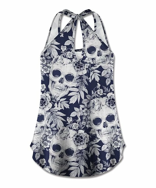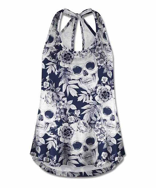 Beat the heat in rocker-chic fashion with this halter top decked out in a floral skull pattern. A twisty keyhole back makes it a cut above other warm-weather options.